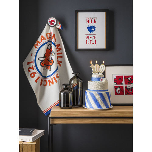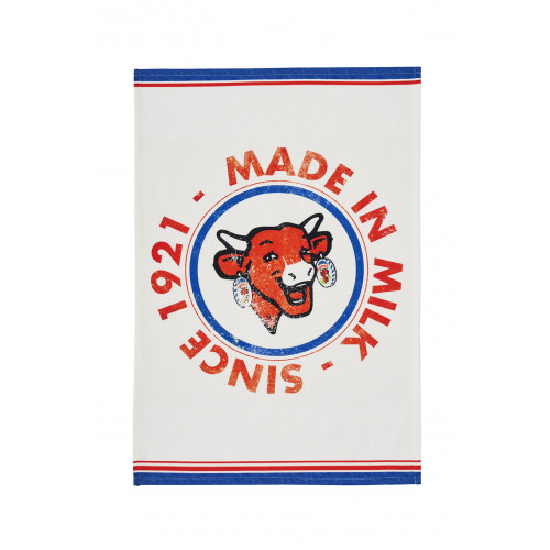 Vintage-style kitchen towel celebrating 100 years of The Laughing Cow® brand, 100% cotton, produced in collaboration with COUCKE; sure to bring laughter to your kitchen!