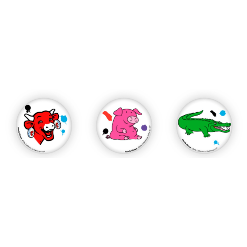 Rehaussez vos tenues avec cet ensemble de 3 badges reprenant le motif de la boîte collector n° 12 La Vache qui rit® créée par Henrik Olesen.