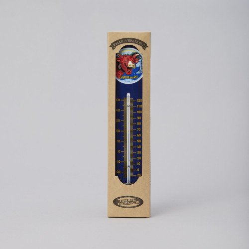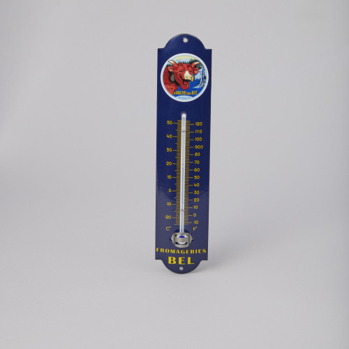 Thermomètre La Vache qui rit® en émail bleu, qui peut être utilisé à l'extérieur. Son design vous donnera envie de regarder la température à longueur de journée !